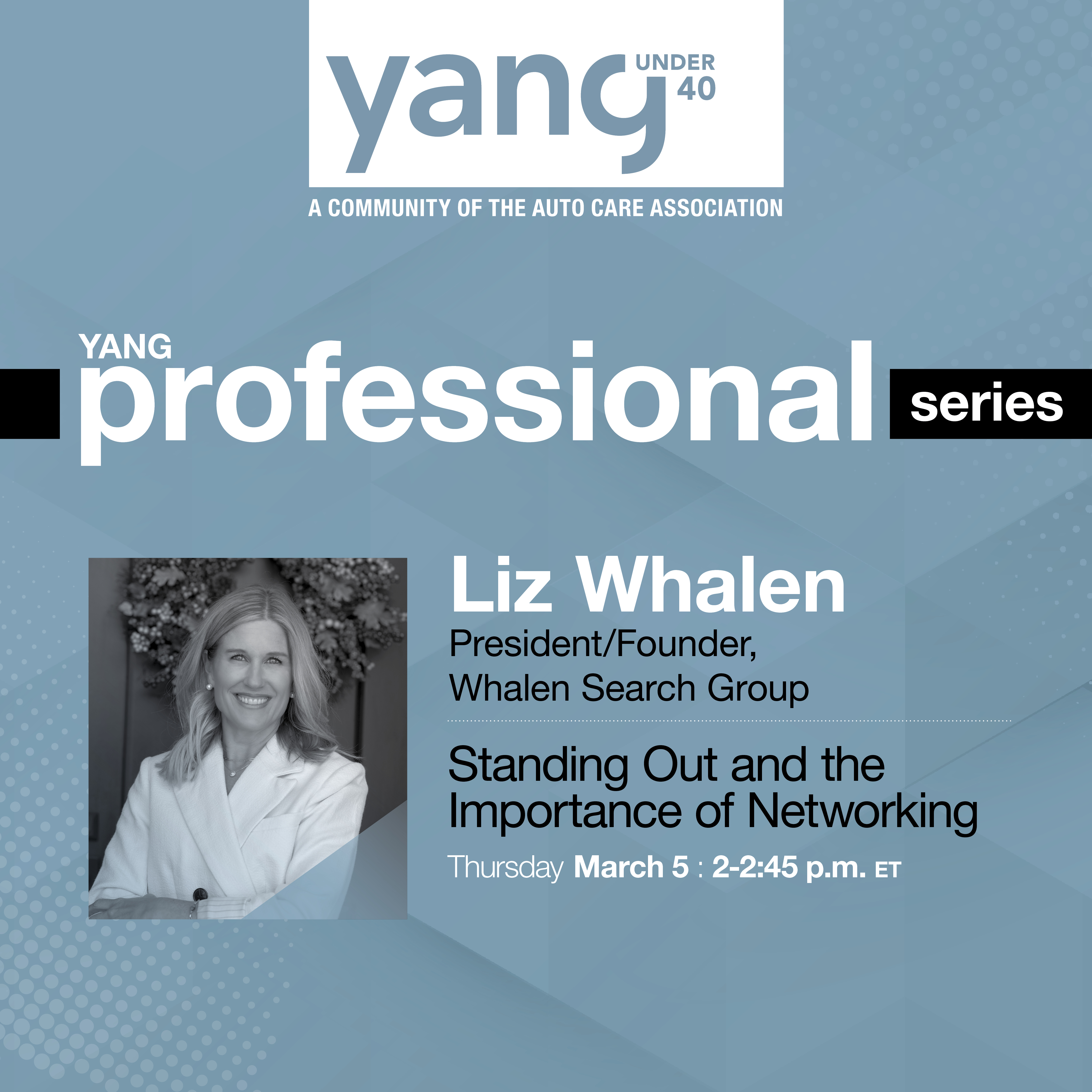 Join us for an informative discussion with Liz Whalen, Founder and President of the Whalen Search Group on why networking is critical for professional development in the automotive aftermarket. Hear first hand from an expert in working with talented leaders and executives about best practices to uplift your confidence and visibility as you grow your career.
