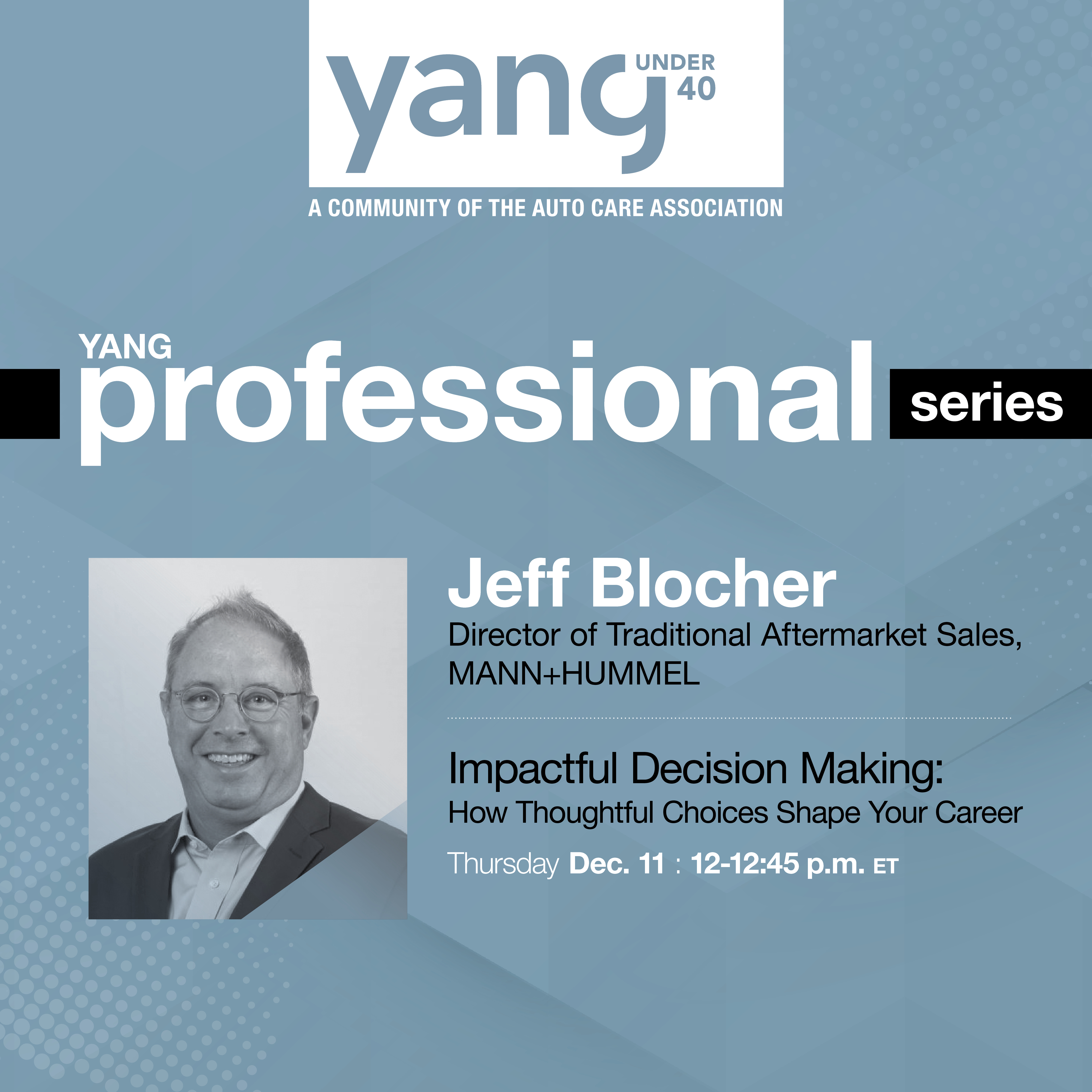 Join YANG for its next professional series event featuring Director of Traditional Sales at MANN+HUMMEL, Jeff Blocher. The YANG Professional Series is a virtual event bringing together YANG members to talk about key issues, hot topics, and opportunities in the automotive aftermarket. The topic for this professional series conversation will focus on impactful decision making of how thoughtful choices shape your career.